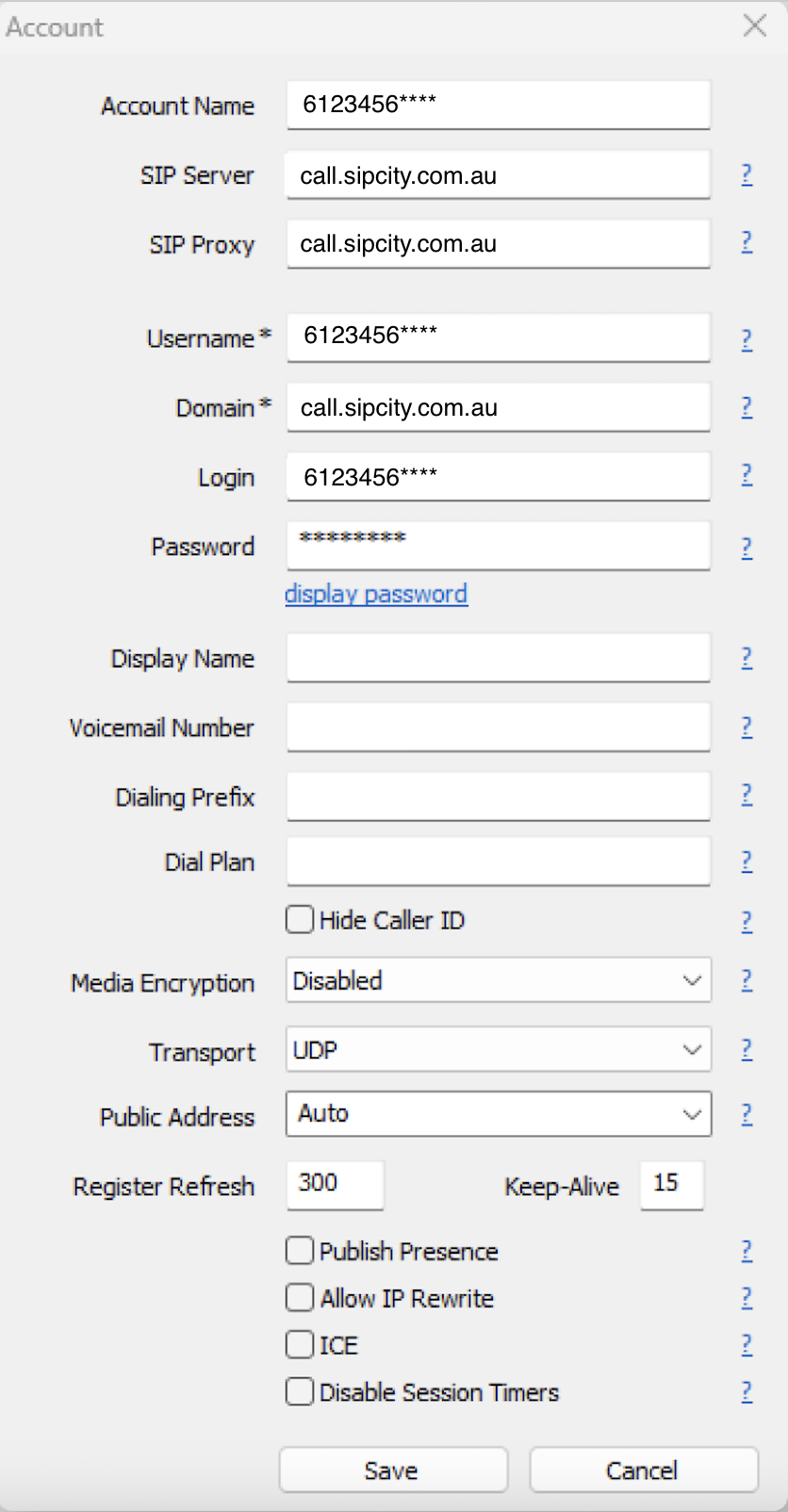 Password: [your number password] -You can set this up by logging into your SIPcity portal at go.sipcity.com.au. Once logged in, go to Numbers and Features, then Switchboard. Find your number and click on it, scroll down to Number Settings, and turn on the restricted toggle to set a password. This password is what you'll use for MicroSIP registration.